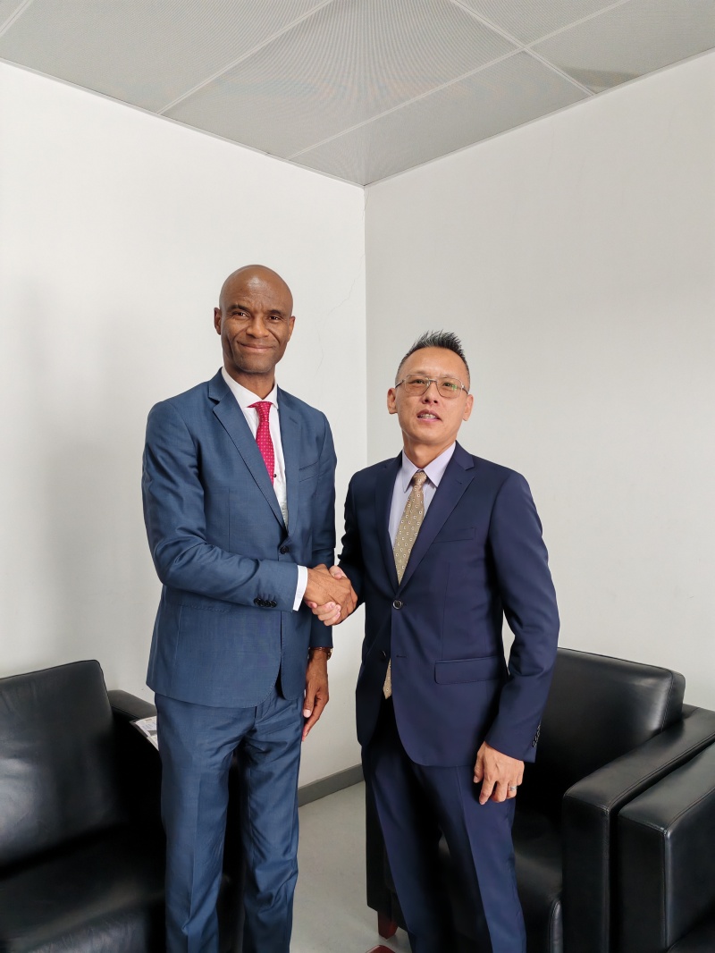 4月7日,驻非盟使团经商处吕瑞浩公参会见非盟委员会经贸司代司长帕特里克。双方就加强政策协调、深化中非盟经贸合作等进行深入交流。秦璐二秘、张博琳随员参加。