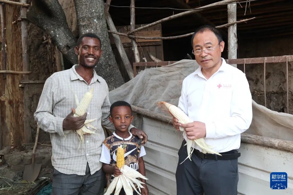 11月26日,在埃塞俄比亚奥罗米亚州的戈迪诺村,中国援埃塞俄比亚第四期高级农业专家组副组长刘守云(右)与村民阿布·内加什(左一)展示新收获的玉米。新华社记者 刘方强 摄