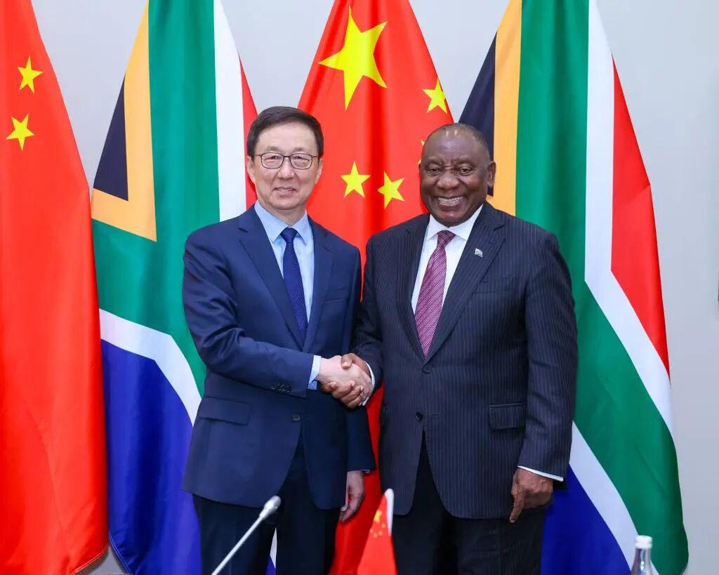 当地时间2026年3月25日至27日,应南非副总统马沙蒂莱邀请,国家副主席韩正访问南非,在开普敦会见南非总统拉马福萨,同副总统马沙蒂莱共同主持召开中南国家双边委员会第九次全体会议,并会见南非国民议会议长迪迪扎。